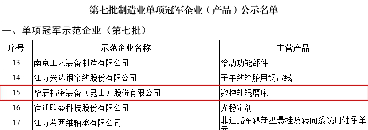 近日,工業和信息化部、中國工業經濟聯合會組織開展了第七批制造業單項冠軍企業(產品)培育遴選工作,江蘇省工業和信息化廳公布了第七批制造業單項冠軍企業擬認定名單,周市鎮華辰精密裝備(昆山)股份有限公司成功入選,是昆山首家獲此殊榮的企業,實現了從省級專精特新中小企業、國家級專精特新“小巨人”企業到國家級制造業單項冠軍企業“三級跳”。